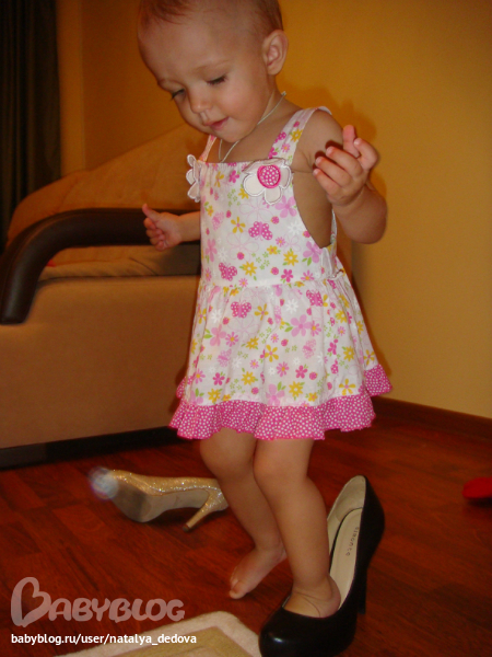 Мои туфли это просто навождение, тащит их отовсюду, выбирает, мерит, даже ходить пытается, но я ей не даю) боюсь на таких каблуках ноги переломает себе.
