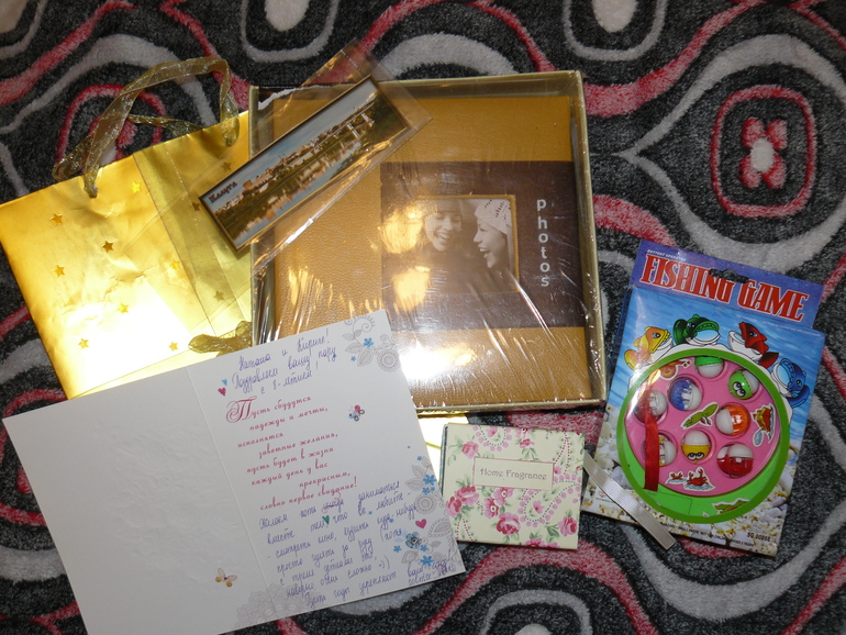 А я уже получила подарок к годовщине свадьбы, которая будет 3 сентября. Наша феечкаsolntse_kekes подарила нам фотоальбом, очень интересный ароматизатор, игрушку-рыбалку для малышей, магнитик из Калуги и открыточку с очень теплыми пожеланиями. Спасибо тебе большое, наша феечка