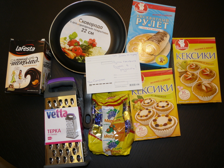 Приехали ко мне супер-пупер подарки по ОП "День на кухне"!!! Честно говоря, я слегка в шоке! Моя фея точно телепат! Я так хотела такую терку, вот-вот собиралась приобрести, а тут на тебе - подарочек! А еще классная сковорода, горячий шоколадик (вкуснотаааа!), смеси для выпечки кексов и рулета, ну и, конечно, конфетки!