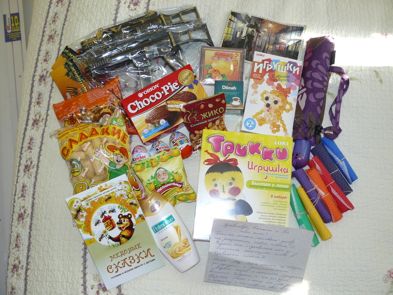 Тут и игрушки и сладости детишкам, и гель для душа, книжечка, наборчики для детского рукоделия, тканюшки мне для куколок, зонт (очень красивый!), обложечка для паспорта, орешки, чай, вышитый магнитик для холодильника. И такое душевное письмо!!! Спасибо огромное, Света!