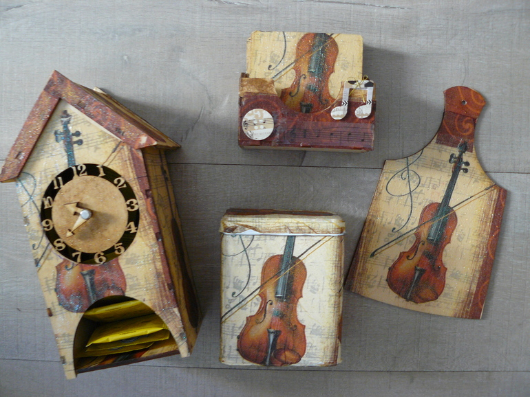 Вот такой задекупаженный набор из чайного домика, подставок под чашки, досочки и коробочки, а также две книжки, музыкальная шкатулочка игрушечная, магнитик и мешок конфеток "Минор". Все супер-музыкальное!