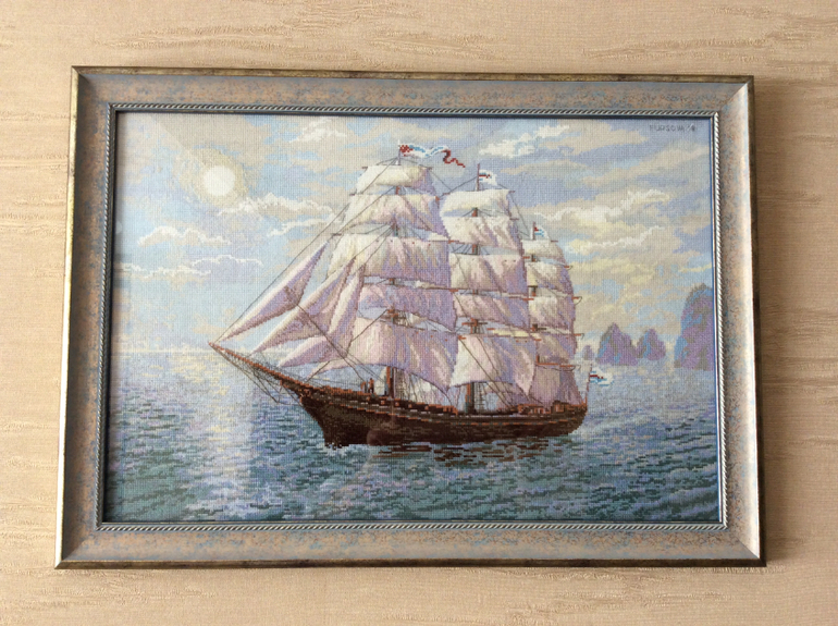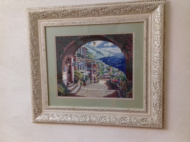 Еще в позапрошлом ВД к концу 2017 года завершила я вышивку "Прибрежного вида" от Dimensions. Но обитать эта картина должна была в нашей "курортной" квартире, хозяйка которой свекровь, и картина готовилась, собственно, ей в подарок... Приехала картина сюда в рулоне, была оформлена в местной багетной мастерской и, наконец, обрела свое место.