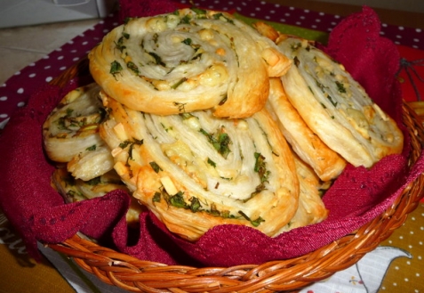 1. Слоеное тесто раскатать в прямоугольник и посыпать мелко порезанным луком с яйцом и натертым сыром, свернуть рулетиком.