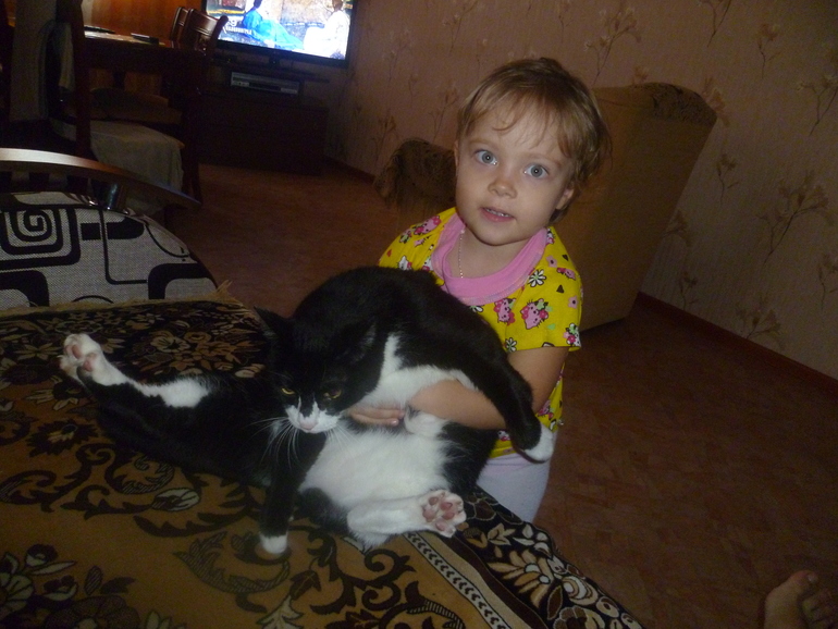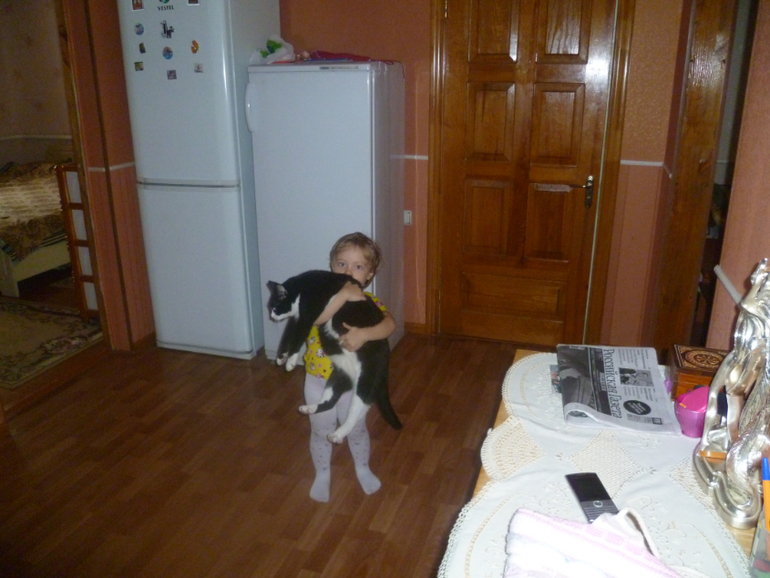 наш бедный котейко ))) весит 8 с лишком кг, но Даша все время его таскает )