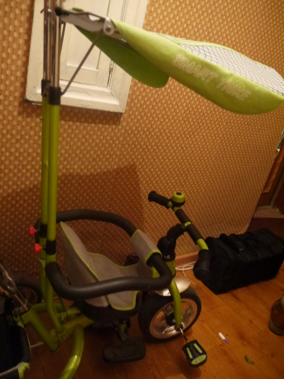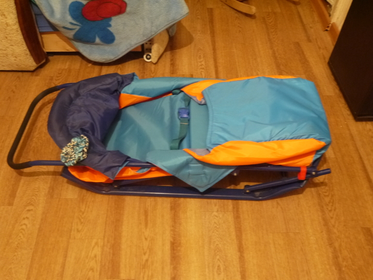 Санки-коляска. Без колесиков, так что либо только по снегу, либо (если муж рукастый) можно самим прикрепить колесики, что бы при наклоне ехали по асфальту. Есть косяк - прорезь на капюшоне возле ручки. Заплатку ставить не стала, просто резинку завязала (ну вот совсем я не рукодельная), но на качестве санок это не сказывается. Очень компактные. У меня хранились дома на шкафу. 500 руб (продано)