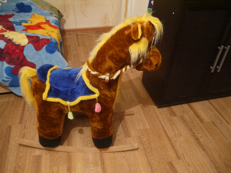 Конь, ...ать его так ))) Качалка, но большая, явно не для крох, лучше лет эдак с 2-х. Даша до сих пор сидя на нём не достает ногами до пола )) Лошадка крепкая и симпатичная )) 500 руб