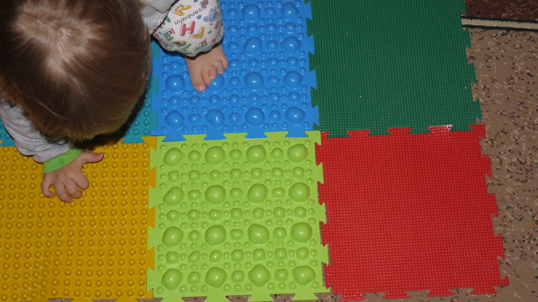 Сегодня забрала наш очередной заказ. На просторах интернэта наткнулась на такую прелесть! Сборный прорезиненный тактильный коврик.