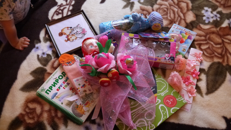 На этом чудеса пятницы не закончились. К нам прилетела прекрасная Фея Ксения с маленьким принцем Пашей! Принесли потрясающие подарочки для Дарёнки! Даша тут же стала всё рассматривать, периодически уточняя, можно ли доставать из пакета и не веря своему счастью, что это ВСЁ ей ))) А я с удовольствием понянькалась с Пашулей, с наслаждением вдыхая запах младенца (детки ооочень вкусно пахнут молочком!). Дашуле тоже было интересно смотреть на Пашу, гладить его. Для неё это настоящая куколка!