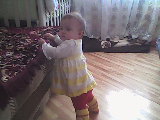 Ну, вот, наконец-то стали вставать самостоятельно, из-за ходунков Даша ни ползать, ни стоять не спешит. Ещё решили купить Даше барабан, так как она очень любит по всему стучать. Но просчетались, барабан её заинтересовал в качестве головного убора, ещё она им может ударить :)