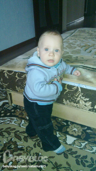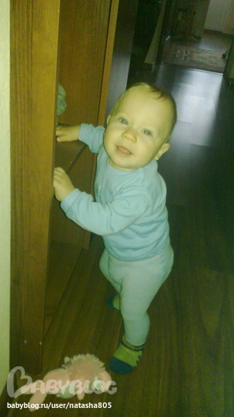 Ходит с поддержкой за диваны, стулья, стены и т.д. Хлопает в ладоши. Говорит мама, баба, нет. Уже 4 зуба - два нижних и два верхних. Спит 2 раза (1 раз пол часа, другой 1,5-2 часа). Ночью с 21 до 7, но пару раз просыпается поесть грудь.