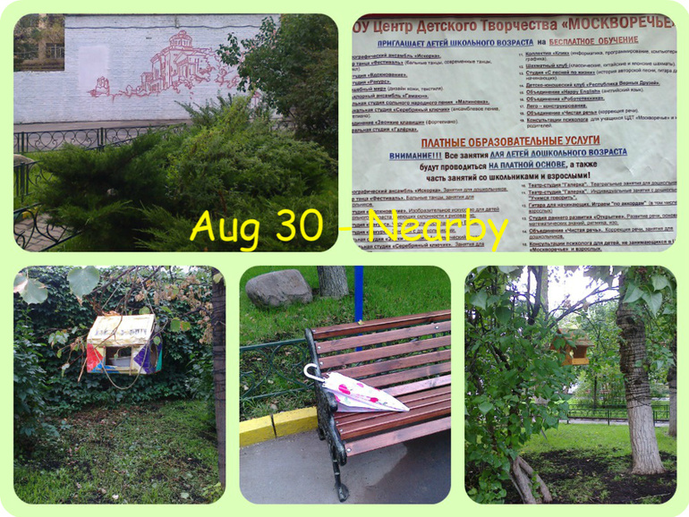 Сегодня мы ходили в кино, а рядом с кинотеатром был небольшой уютный скверик, мы там немного погуляли перед сеансом... На деревцах висели красивые кормушки для птичек, на лавочке кто-то забыл свой зонтик, на детской площадке играли детки, кто-то читал, сидя на лавочках, а кто-то просто прогуливался по дорожкам... А в воздухе витала осень.