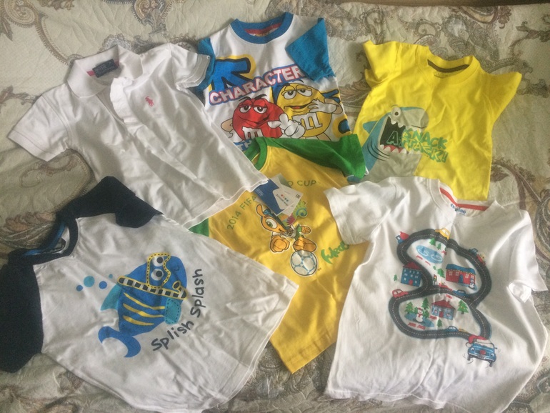 На первом фото все новые, кроме с акулой, размер 110-116, с акулой 98, экв 400 р, новые 700 руб, которая поло Ральф Лаурен 1200 р