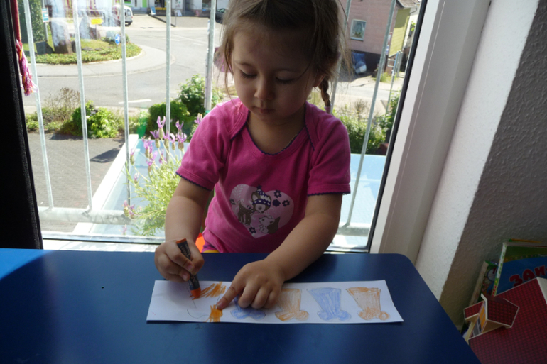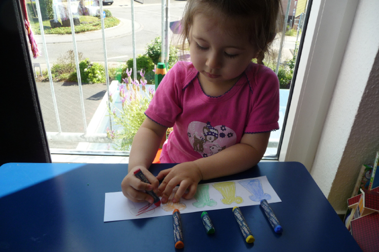 Дальше нужно было отгадать какого цвета должно быть платье. Я дала бланк с платьями разных цветов, где одно платье было не закрашено, и цветные мелки, по количеству платьев. Сначала мы соотнесли мелки и платья по цветам, и т.о. определили, каким цветом Эвуша будет закрашивать платье.