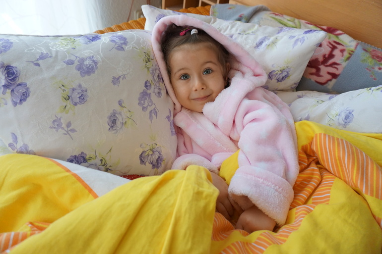После ванночки в кушелевом (это мы так свё мягкое называем) халатике легли на кушеточку и зарылись под одеялко)