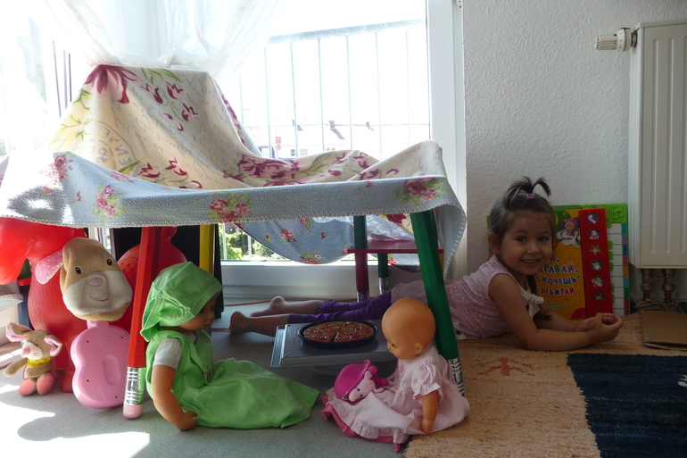 Нам 3 годика) За 3 года дом буквально "оброс" игрушками, книгами и развивающими пособиями. Каждые полгода проводим операцию "Разхламление", собирая коробки того, из чего уже выросли (включая одежду), что уже не интересно и того, что лично я считаю не полезно для моего ребёнка. Но это не помогает((( Да, потому что, на смену старым игрушкам приходят новые, новые книги (книг у нас действительно очень много), поэтому места дома не прибавляется. Давно заметила : чем больше игрушек, тем меньше они ценятся( Да, печально, но факт. Помню своё детство. На игрушки мама денег не жалела, но такоооого количества у нас с братом не было. Сама люблю все дочины игрушки, но пришла к выводу: надо что-то менять! Поэтому безжалостно, со всем тем, с чем дочка играет очень редко, мы расстались и будем продолжать расставаться. Оставили конструкторы, настольные игры по возрасту, кукол (без них вообще никуда), кассу, овощи-фрукты, транспорт, кухню, счётный материал, материал для занятий на развитие моторики. Минимальный набор игрушек способствует развитию воображения. С этим у нас никогда не было проблем, а сейчас, с минимальным количеством игрушек, игры принимают всё более и более интересный характер.