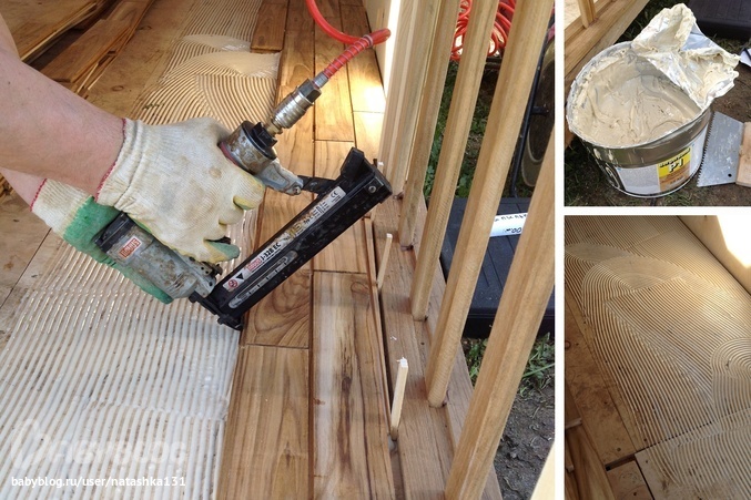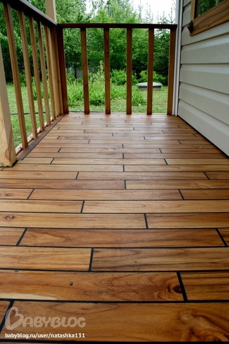 "Какой дом без приличного пола?", спросил папа и постелил паркет:))) "Тик" под герметик. Влага ему не страшна. Перила на веранде тоже сделаны из него. Фото в процессе укладки