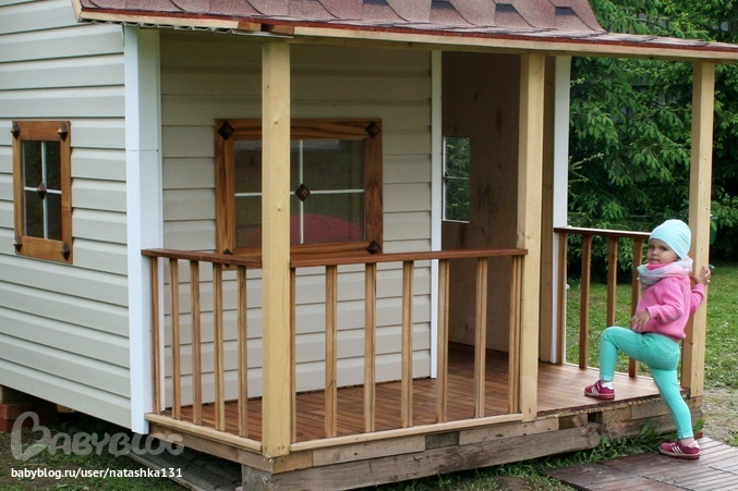 Двери пока нет, как и времени на ее строительство:) Перила не покрыты маслом, нет ступенек и еще много чего по мелочи. Внутреннюю отделку еще даже не начинали. Там планируется вагонка в розово-сиренево-белых тонах, вот:)