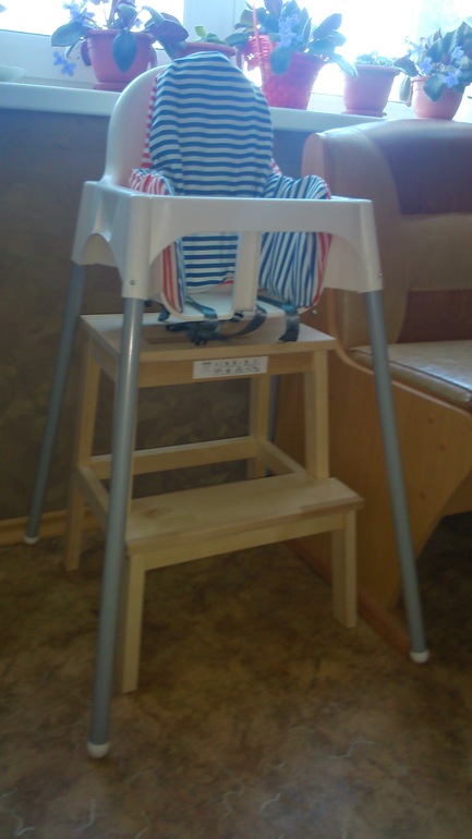 Купили недавно сыночку стульчик для кормления, а для старшей дочки подставку такую чтоб удобней ей было до раковины доставать и шкафы открывать. Места на кухне у нас мало очень и я вот до сих пор в приятном удивлении, что оказывается они могут очень компактно стоять. Один под другим! Очень удобно.