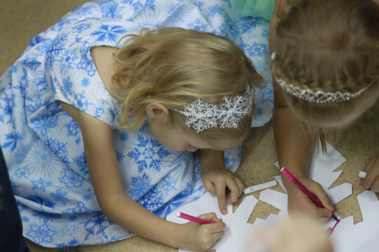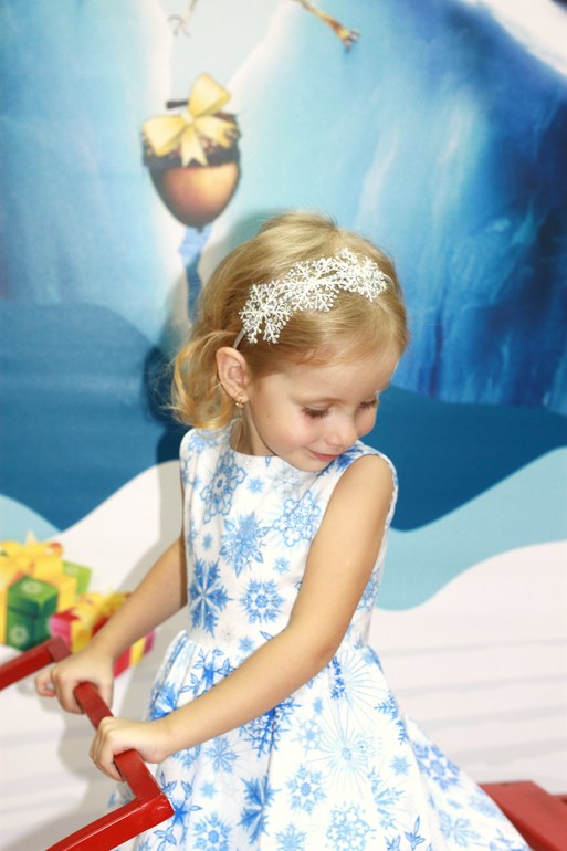 Лиф платья украшен стразами. Даже на голову найти украшение оказалось не так-то просто, единственные снежинки, что подвернулись сменили бантик на прошлогоднем ободке, их я тоже украсила стразами.