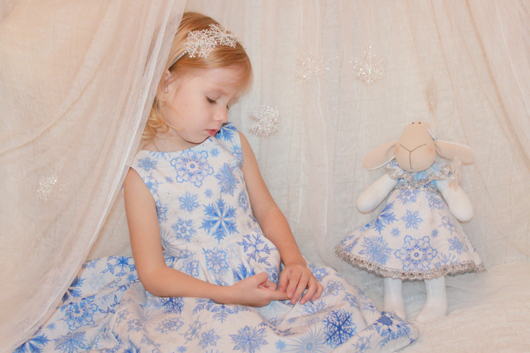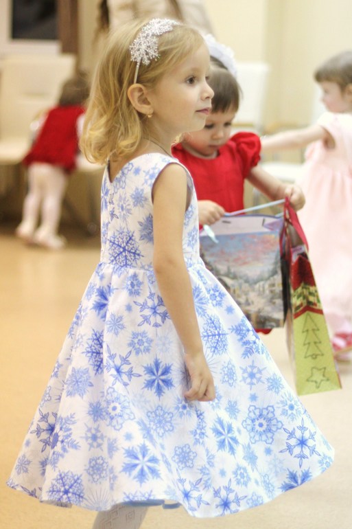 У дочки пока не было никаких пожеланий по поводу карнавального костюма, поэтому я снова пошла по легкому пути и сшила платье из ткани на новогоднюю тему. Кстати, удивилась, что "Снежинок" становится все меньше и меньше на утренниках. Ну теперь немного про платье. Ткань - американский хлопок, опять же мои фотографии не передают всю красоту этой ткани, сверкающей серебром. Увидела еще в прошлом году платье из подобной ткани у Юлиной дочки с Осинки, у нее оно шикарнее во много-много раз, наше же, как обычно, самого простого кроя - с завышенной талией, юбка - полусолнце со сборкой. Платье в меру пышное, за счет подъюбника с нашитой оборкой из жесткого фатина, в этот раз оборку обработала косой бейкой голубого цвета, чтобы было красивее, когда "Снежинка" будет в танце кружиться. Хотела сделать к платью пояс с декором из снежинок, но так и не смогла найти ни подходящих красивых снежинок, ни ткань, а потом вообще неожиданно увидела болеро серебристое и оставила в покое идею с поясом, хотя он очень просится сюда.