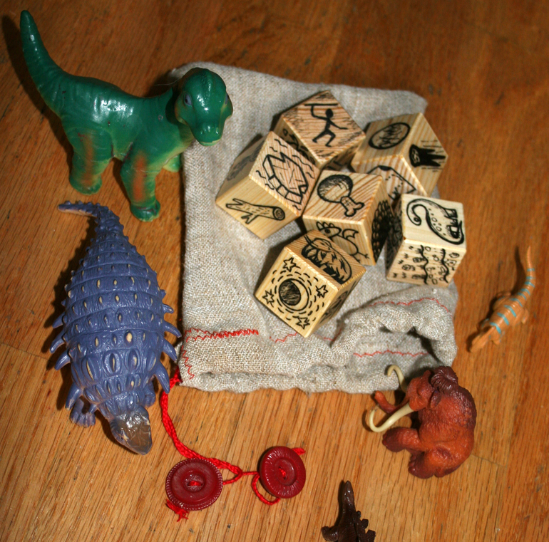 Об этой замечательной настольной (напольной, надиванной, дорожной итд)) узнала именно тут, на ББ. разу же зачесались руки и в ход пошли деревянные кубики от конструктора. Несколько комплектов на разные и смешанные темы возникли в течении дней двух. Потом собирала тематический подарок для пятилетки и изюминкой его стал мешочек с кубиками-историями на тему динозавров. Чистые кубики купила в магазине с товарами для декора и рукоделия. Готовые не успела даже сфотографировать. Благо, сын попросил сделать ему такой же. С первым комплектом немного сложновато было придумать 36 картинок, которые можно объединить одной темой. Со вторым стало ясно, что еще 1-2 кубика можно добавить запросто. На комплект уходит 6 кубиков, 1 гелевая ручка и 1 пузырек лака.