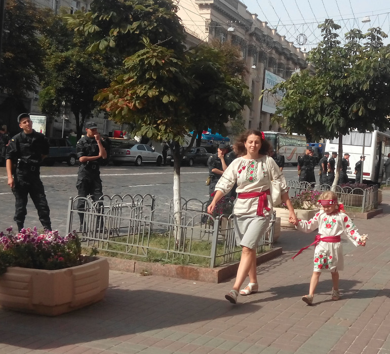 Фото сделала по дороге домой (с Майдана). Было интересно, как долго тянется охрана по ул. Б.Хмельницкого. Шла и щелкала беспрерывно (всегда много щелкаю, даже ради одного кадра). Дома пересмотрела - НИ одного фото без вышиванки. Люди идут навстречу - молодые и старые, семьи и пары, девушки и юноши - нарядные-пренарядные. Красивый город, красивая страна, красивые люди. Сердце щемит.