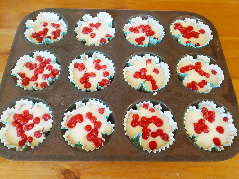 Разделить тесто по формам. Ягоду уложить на тесто.