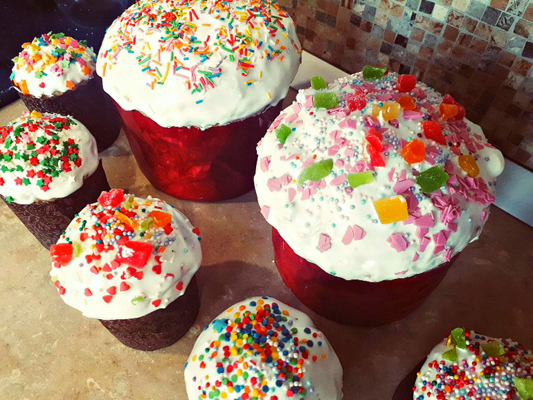 5)делаем глазурь из белка и пудры и украшаем наши куличи