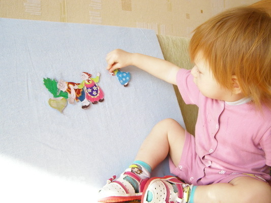 Сегодня занимались с альбомом по развитию речи - изучали там овощи и фрукты. Счачала просто смотрели и обсуждали картинки (как выглядит. где растет, какое на вкус и т.п.), потом принесли картинки которые у нас были и накрывали в альбоме. Все сама правильно сделала. Жалко не все у нас картинки есть, нужно этим будет заняться!