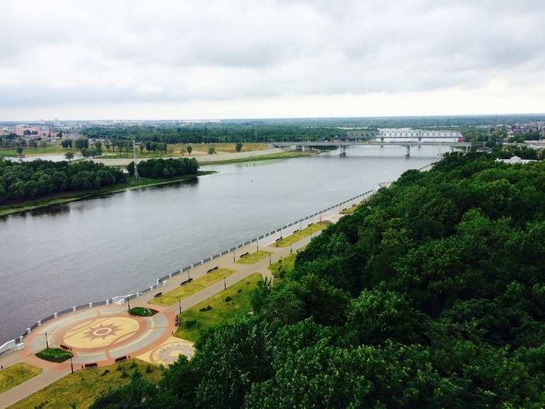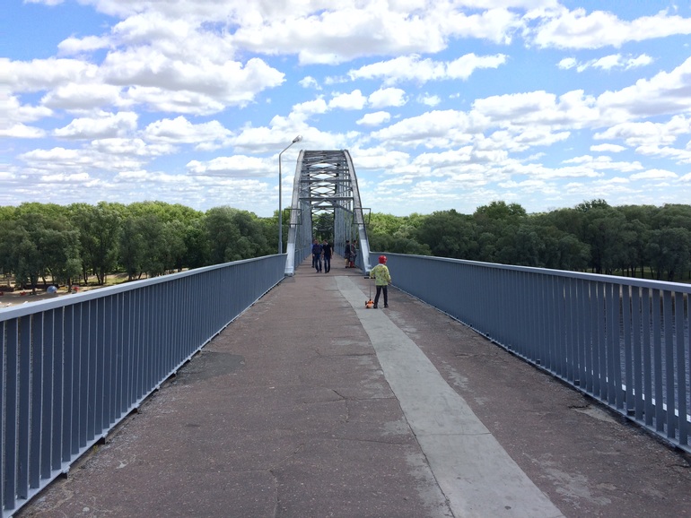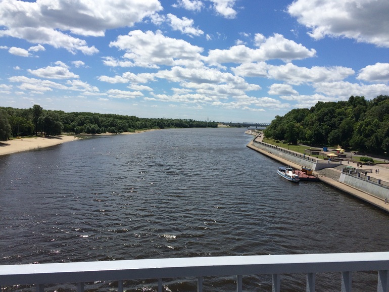 далее пошли ко Дворцу. через Сож тоже перекинут пешеходный мост. виды-красивые. на том берегу- песчаный пляж.