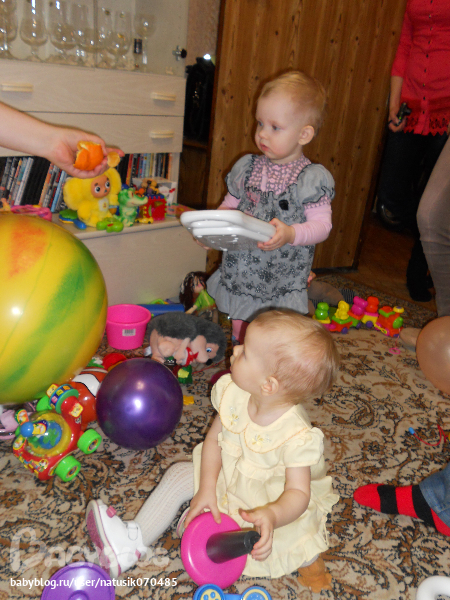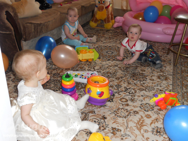 Вот и пролетел первый год жизни нашей малышки.Кажется только недавно из роддома привезли, а уже топает вовсю! 6 апреля к нам приходили родственники и друзья, с трудом за столом уместились)) Кирюшка как принцессочка в нарядном платье, куча подарков, море улыбок и все такое прочее))) Потом устроили детский день рожденья, пригласили знакомых деток. Вместе с мамами получилось 14 человек! Настоящий дурдом был, и мамы, и дети были в восторге))) Игрушки, восдушные шарики, надувной бассеин (с игрушками вместо воды). И очень вкусный и красивый торт!