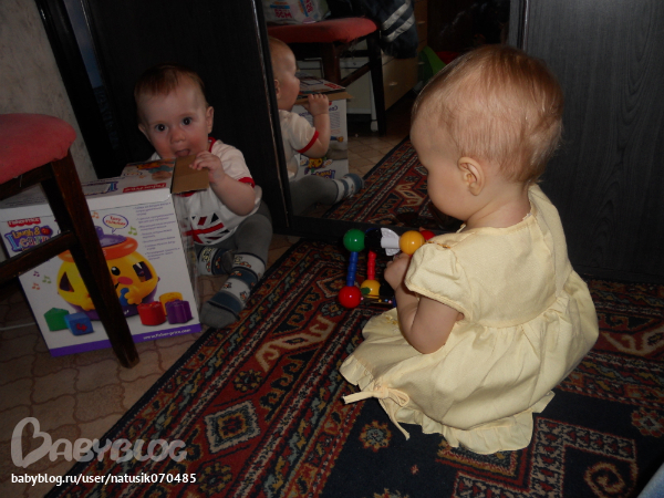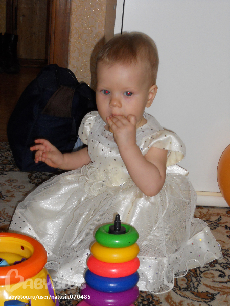 Ну а из новых умелок: в 11,5 месяцев Кира пошла. Зубов все так же 6. Говорит мама, папа. Хотя использует пока эти слова как получится, не всегда в тему)) Когда ей что-то надо, говорит "Гать!". Это у нее и "дай", и "на". Ну и всякой тарабарщины полно: "кать", "кау", "гадять", "га-я" и все в этом роде. О значении догадываемся по интонации и ситуации. Научилась воздушные поцелуи посылать, обниматься. Крехтит, когда хочет на горшок (или когда просто его видит). Кушаем пока не очень, в основном баночное мясо и коробочную кашу. От нормальной еды упрямо отказывается, причем голодать может долго, у нее же сися есть! Она ее всегда от голода спасет. Весит 8350, рост 81.