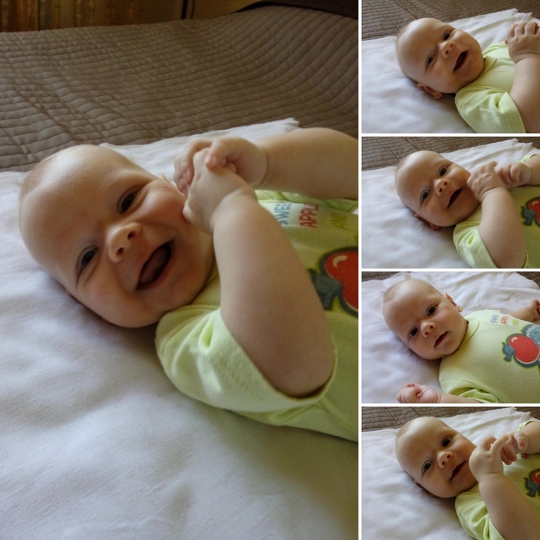 Что мы умеем... Широко улыбаться всем, кто с нами ласково разговаривает, гулить, поворачиваться на бочок, высоко поднимать ноги, стучать по висящим над кроваткой (коляской) игрушкам, лежа на животе высоко поднимать голову, иногда переворачивается с живота на спину, купаемся в круге, кушаем мамино молочко 7-8 раз в сутки, сосем пустышку, засыпаем без укачиваний, гуляем 2-3 раза в день в коляске...