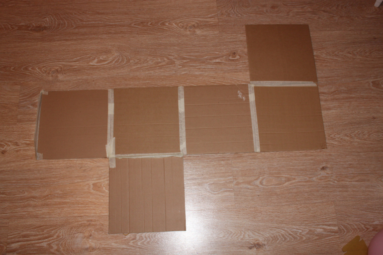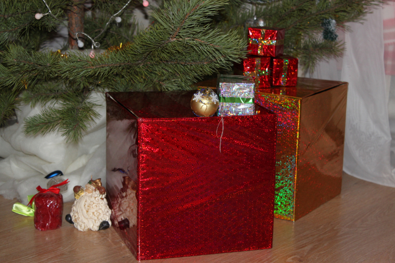 Коробку сделать очень просто. Из 6 квадратов любого удобного вам размера. Я вырезала из кофрокартона и склеивала скотчем. Затем оклеивала упаковочной бумагой. Скрепляла стенки скотчем. А когда праздники закончатся, я просто разрежу скотч (там буквально три полоски) и сложу коробки до размера двух квадратов. Хранятся они у меня на антресолях до следующего года.
