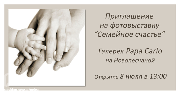 Здравствуйте! Фотографы приглашаются к участию в фотовыставке "Семейное счастье" в московской арт-галерее! Выставка откроется в июле 2012 года и продлится месяц. К участию приглашаются фотографы, имеющие в своем портфолио работы на тему "семья, семейный портрет, семейные традиции, связь поколений в семье". Сбор работ превью до 01 июня 2012 года. Место проведения выставки - арт-галерея в престижном районе Москвы. Полная информация по запросу на почту: expo-photo@yandex.ru