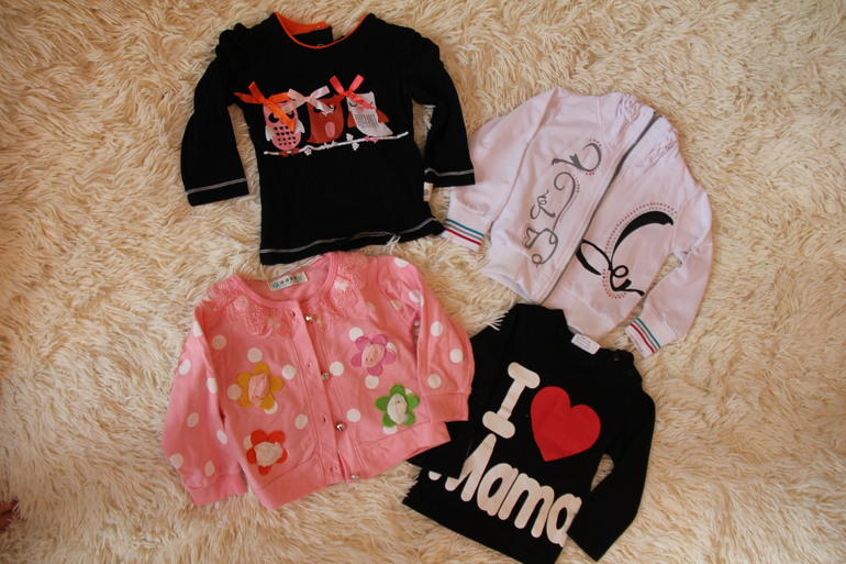 10. кофта белая на молнии - 80 см - 150 руб, черная с совушками -90 см (мне кажется, что маломерит, не носили ее) - 100 руб, черная папа мама 80 см не носили - 100 руб, розовая с цветочками до 90 см - 100 руб (РОЗОВАЯ КОФТА продана!)