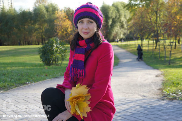 беретик с попмпоном и шарфик(три цвета цикламен,чёрный и фиолетовый) , на фото моя заказчица
