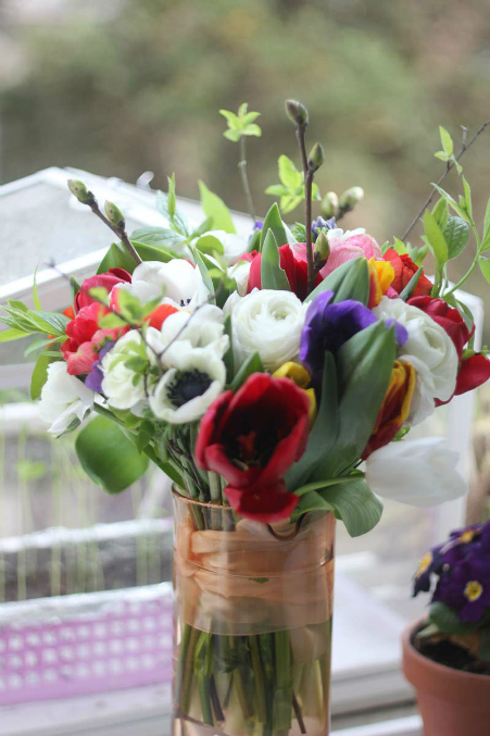 Сегодня у моей сестренки день рожденья! По этому поводу испекли мы с Гла ей торт (первый раз в жизни пекла торт, вроде получился, но фоток не будет, под конец желе для фруктов потекло через кремовый бортик и он стал не для показа, но все такой же ароматный). Накупила ей деорогущей декоративки в m.a.c.-е (хаха, мое ненакрашенное лицо и этот магаз просто несовместимы, я выглядела бледным пятном на фоне боевого раскраса консультантш))). Так как бютжет был исчерпан, думала обойдется она без цветов, но на рынке сегодня не удержалась и накупила цветочков для букета. По ходу движения домой наломала еще веточек и вот, что получилось.