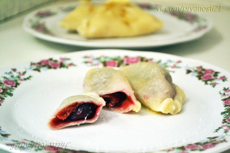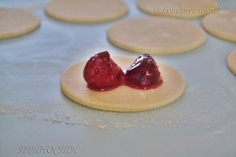 Тесто раскатать ,вырезать кружочки, положить внутрь начинку и слепить вареники. Для вареников с вишней- ягоды стараемся класть без сока, по 2-3 штучки на вареник вполне достаточно.