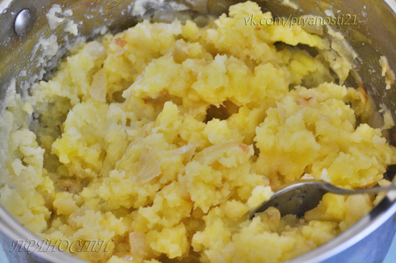 Отварить картофель в мундире. Лук обжарить на небольшом количестве сливочного масла до золотистого цвета. Отваренный картофель немного остудить ,очистить , добавить немного слив. масла и размять в пюре , посолить по вкусу и добавить половину обжаренного лука , все хорошо перемешать.