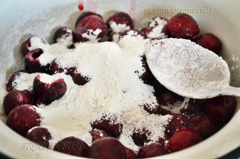 Вишню разморозить, посыпать сахаром и крахмалом, оставить минут на 15-20 чтоб пустила сок.