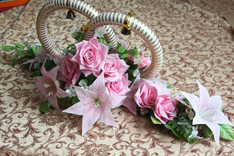 б/у 1 раз. Розовая композиция с лилиями и розами. Два колокольчика. экв. 1500