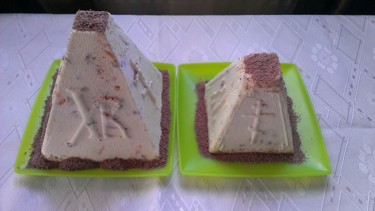 Творожную пасху делаю я по нашему любимому рецепту,только каждый год украшаю по разному.Сейчас она украшена шоколадной крошкой.