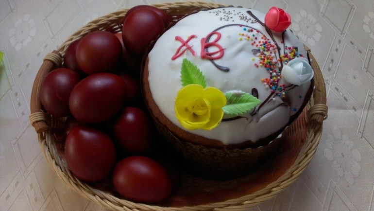Кулич у нас покупной,а яйца красит только муж.Из года в год,луковой шелухой.