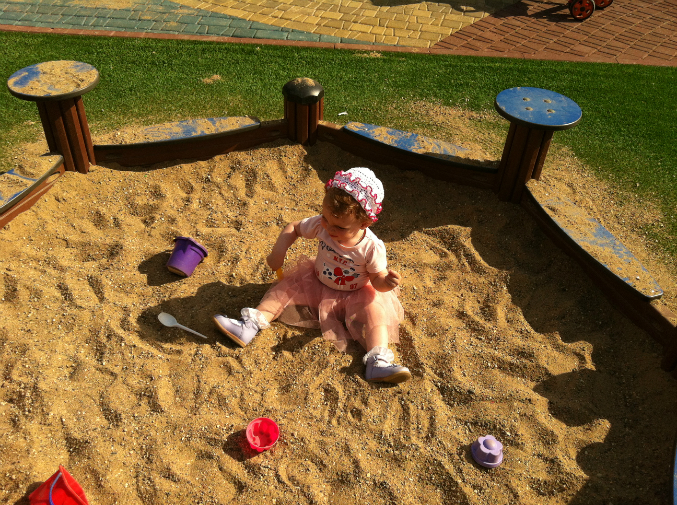 В песочнице мы часто сидим на попе, не умеет моя долго на коточках сидеть...