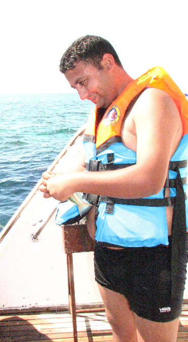 это наш гид Мустафа - очень приятный, веселый парень, много интересного рассказал, он хорошо говорит по русски, язык учил в Каире, ни в России ни на Украине он не был ни разу, плавать не умеет - живет далеко от моря, здесь в Хургаде работает, это город для туристов и работников, средняя зарплата у египтян 100-200 дол...