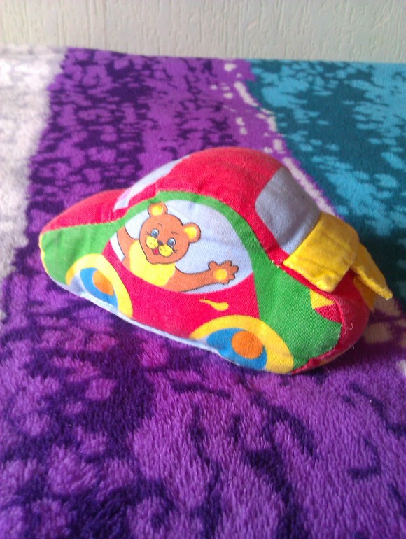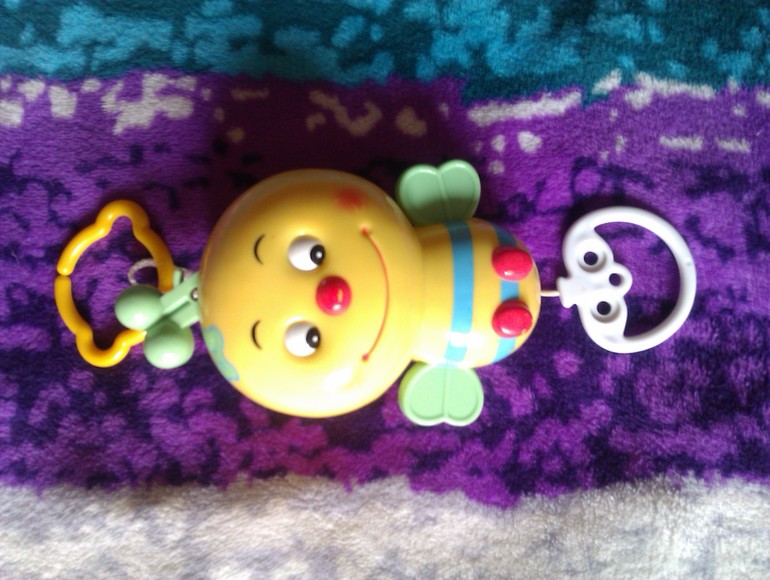 Куда и откуда только не летала эта музыкальная пчелка: и из коляски, и из кроватки, и просто по полу таскалась. и ходили по ней, и спотыкались... А она все держится! Большой плюс ее, что не требует батареек. все элементарно и просто - потянул за веревочку, началась музыка.