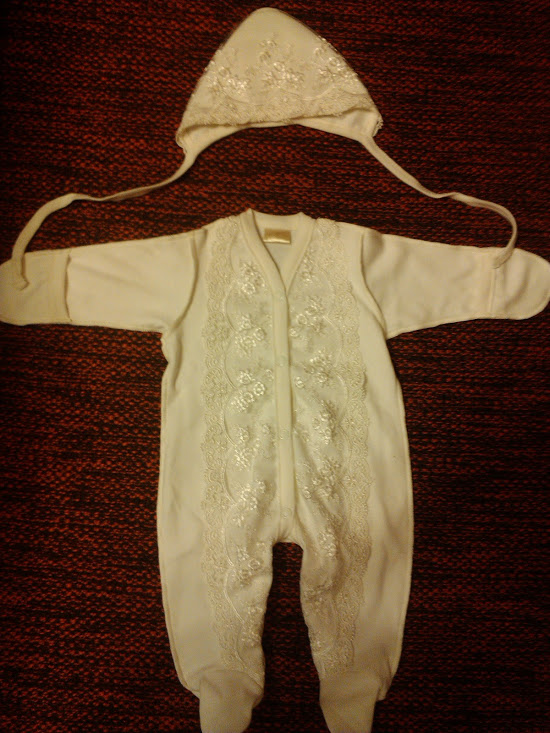 Ну и хвастик. Вчера были у моих родителей в гостях, мама показала, какой наряд на выписку купила внучке (тот самый из-за которого мы поругались). Пока его не отдала: кружево деликатное, хочет сама постирать. Цвет оказался чуть светлее, чем я думала, но костюмчик, по-моему, очень классный!