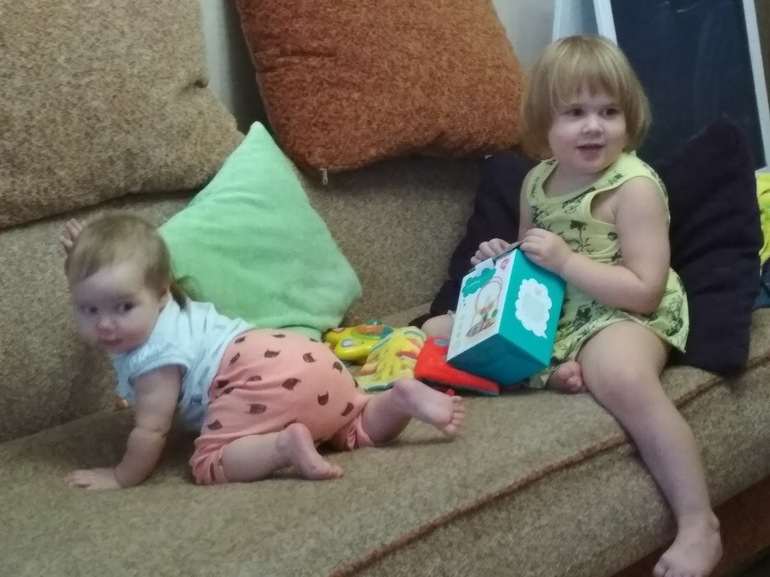Адюша - очень нежная сестра. Сама кормит Дану (в смысле, с ложки, пюрешкой), обнимает. Бросается к ней, если Дана плачет. Если Дана поползла к краю, иногда Ада оказывается рядом быстрее, чем я: "Я тибя дельзю, Данюся!". И ведь, правда, держит, крепко. Только что заходила в спальню, спят в обнимку) Хотя укладывали их на разных концах кровати) Вытаскивает изо рта недозволенные штуки, предлагает полезные и разрешенные игрушки. Угощает и делится, если Дане можно то, что кушает Ада. Злится, конечно, если Данка лезет к ней и мешает играть)))) Может по руке шлепнуть ее, но не больно, скорее, для острастки. Я стараюсь такие порывы пресекать, учу её маленьким хитростям, как переключить внимание младенца. Больше всего мне импонирует то, что все эти действия у нее естественны. Они идут изнутри, от сердца. И, если честно, я думаю, что, помимо чудесного характера, которым Аду наделил Господь, такое поведение - еще и результат нашего с Сережей труда. Результат того, что мы ярко и свободно демонстрируем свои чувства, друг к другу, к своим родителям, к нашим детям. Не только положительные, но положительные - в первую очередь. У нас в семье много тактильности, мы много обнимаемся, целуемся, часто прикасаемся друг к другу. Дети видят наши объятия и с радостью их с нами делят "(Мама, папа, и миня, миня тёзе!!!").