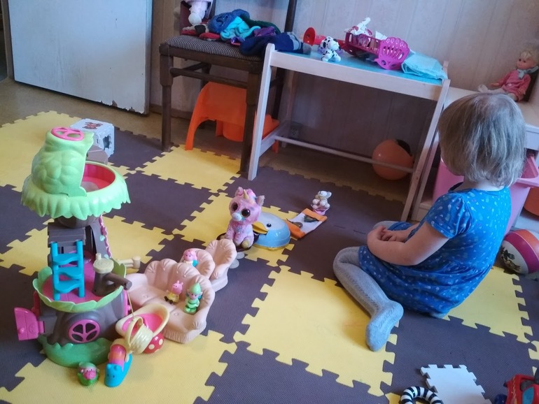 Может играть сама, довольно долго, но всегда предпочтет компанию родителей. Пытается играть с детками, но пока что слабо получается: каждый гнет свою линию...